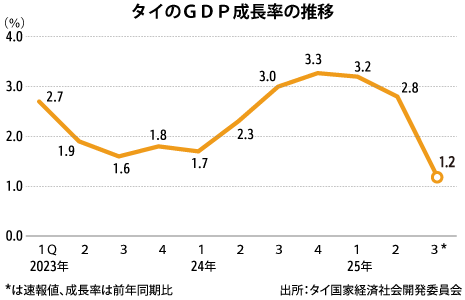 タイ3QのGDP、1.2%に減速4年ぶり低水準、製造・観光停滞PICK UP経済自動車食品・飲料その他製造建設・プラント外食・飲食観光マクロ経済統計貿易政策・法律・規制インフラ設備投資政治一般NEWタイ国家経済社会開発委員会(NESDC)は17日、2025年第3四半期(7~9月)の実質国内総生産(GDP)成長率が前年同期比1.2%(速報値)だったと発表した…