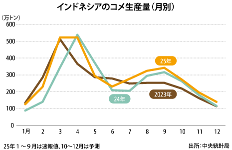 インドネシア9月コメ生産8.4%増、年内変わらずプラス農水統計食品・飲料農林・水産インドネシア中央統計局が3日に発表した9月のコメ生産量は前年同月比8.4%増の343万トンだった。10~12月の生産見通しは前年同期比8.9%増の607万トンとなる見…