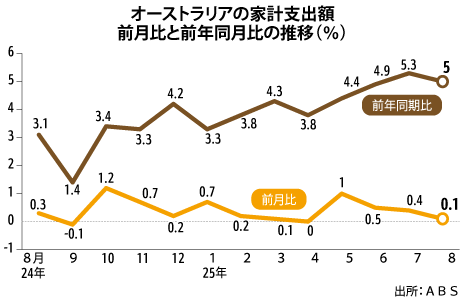 オーストラリア豪8月家計支出、4カ月連続増経済マクロ経済食品・飲料医薬品インフラ卸売りその他サービス観光娯楽社会一般環境小売り外食・飲食オーストラリア政府統計局(ABS)が2日に発表した8月の家計支出額(季節調整値)は、774億3,160万豪ドル(約7兆3,545億円)と前月比0.1%増、前年同月比5…