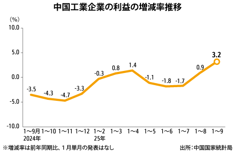 中国工業企業利益の改善継続1~9月、製造業が押し上げPICK UP経済マクロ経済統計自動車IT一般電機食品・飲料医薬品化学一般バイオ繊維鉄鋼・金属その他製造精密機器機械農林・水産石油・石炭・ガス鉱業電力・ガス・水道設備投資政策・法律・規制中国国家統計局が27日発表した2025年1~9月の工業企業利益(一定規模以上の企業対象)は、前年同期比3.2%増の5兆3,732億元(約115兆6,000億円)だった。伸び…
