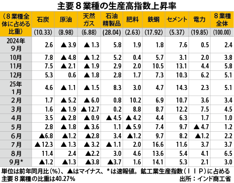 インド8業種生産高、9月は3.0%上昇に減速経済マクロ経済統計化学一般鉄鋼・金属ガラス・セメント農林・水産石油・石炭・ガス電力・ガス・水道NEWインド商工省によると、2025年9月の主要8業種(石炭、原油、天然ガス、石油精製品、肥料、鉄鋼、セメント、電力)の生産高指数(11/12年度=100、速報値)は16…