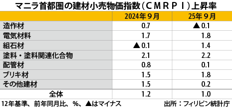 フィリピン首都圏の建材価格、9月は卸売り0.2%下落建設統計建設・プラント フィリピン統計庁(PSA)が14日までに発表した9月のマニラ首都圏の建材物価指数(速報値)によると、上昇率は小売りが前年同月比1.0%、卸売りはマイナス…