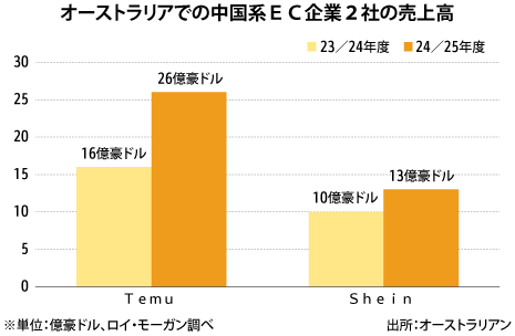 オーストラリア中国ECの台頭、豪小売業界が政府に規制訴え商業マクロ経済貿易IT一般卸売りその他サービス倉庫陸運海運空運メディア雇用・労務政治一般政策・法律・規制小売りオーストラリア小売り大手の経営者らがこのほど、中国発の格安電子商取引(EC)サイトの「Temu(ティームー)」「Shein(シーイン)」「Taobao…