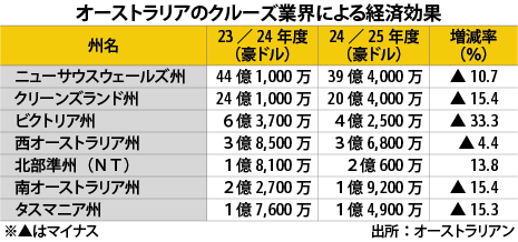 オーストラリア豪クルーズ産業、経済効果が11億$減少観光統計卸売りその他サービス倉庫海運観光娯楽雇用・労務政策・法律・規制小売り外食・飲食NEWオーストラリアのクルーズ産業による経済効果が2024/25年度(6月期)に73億2,000万豪ドル(約7,285億円)にとどまり、前年同期比で11億1,000万豪ドルと13.2%減…