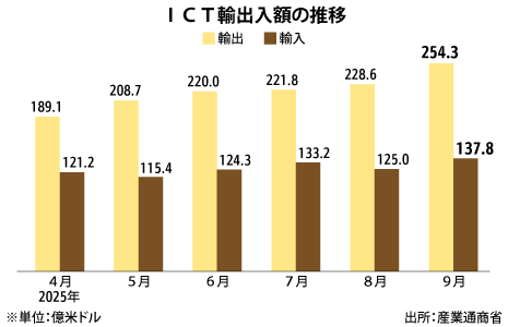 韓国9月ICT輸出14%増、過去最高を更新IT貿易統計IT一般電子・コンピューターNEW韓国産業通商省によると、2025年9月の情報通信技術(ICT)分野の輸出額は254億3,000万米ドル(約3兆8,500億円)と、前年同月比14.0%増加した。半導体がけん…