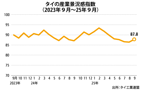 タイ9月の産業景況感、7カ月ぶり上昇経済マクロ経済貿易統計自動車車部品NEW タイ工業連盟(FTI)が15日発表した2025年9月の産業景況感指数(TISI、100以上が好感)は87.8となり、前月から1.4ポイント上昇した。今年2月以来の上…