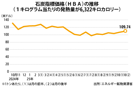 インドネシア10月後半の石炭価格、2.6%増の109ドル資源貿易統計石油・石炭・ガス鉱業NEWインドネシアのエネルギー・鉱物資源省は14日、10月後半の石炭指標価格(HBA)について、1キログラム当たりの発熱量が6,322キロカロリーの石炭を、1トン当た…