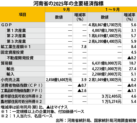 中国河南河南のGDP、1~9月は5.6%成長経済マクロ経済貿易統計NEW河南省統計局、国家統計局河南調査総隊が21日発表した河南省の2025年1~9月の域内総生産(GDP、速報値)は、前年同期比5.6%増の4兆8,867億5,700万元(約1…