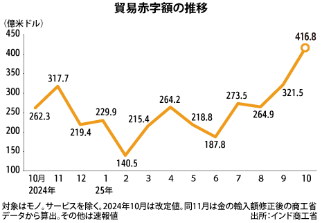 インド10月の貿易赤字、過去最大416億ドル、金輸入3倍に膨らむ経済マクロ経済貿易統計インド商工省が17日発表した2025年10月の貿易収支(速報値、サービス除く)は約416億米ドル(約6兆5,000億円)の赤字だった。赤字額は過去最大となった。輸入品…