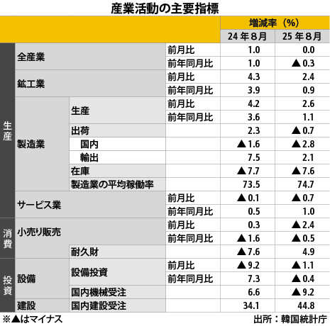 韓国8月産業統計、全分野でマイナス経済マクロ経済統計韓国統計庁によると、2025年8月の産業活動動向(20年=100、速報値)は国内産業活動に関する「生産」「消費」「投資」の全分野で前年同月比でマイナスとなった。…