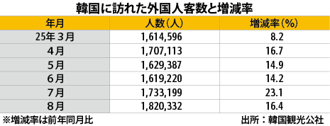 韓国8月の訪韓客182万人、16.4%増加観光統計観光韓国観光公社によると、2025年8月の訪韓外国人客数は前年同月比16.4%増の182万332人だった。新型コロナウイルス感染症流行前の19年同月比でも14.8%増えた。 …