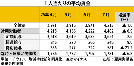 韓国7月平均賃金、1%減の421.3万ウォン経済マクロ経済統計雇用・労務韓国雇用労働省の「事業体労働力調査」によると、2025年7月の従業者1人(1人以上の事業所)当たりの平均賃金は421万3,000ウォン(約44万4,000円)と、前年同月…