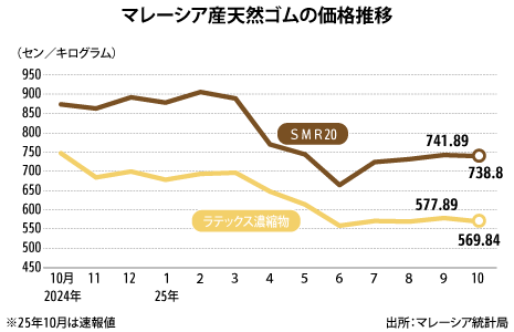 マレーシア10月ゴム生産量、前月比11.4%増の3万トン農水貿易統計ゴム・皮革農林・水産マレーシア統計局が11日発表した10月の天然ゴム生産量(速報値)は、前月比11.4%増の2万9,673トンだった。前年同月比では22.7%減少した。 国内消費量は前…