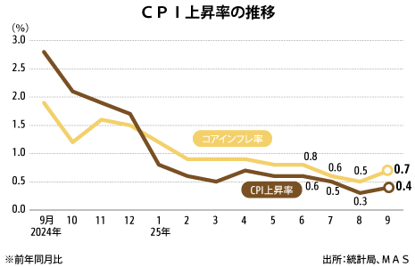 シンガポール9月のCPIは0.7%上昇前月上回る伸び、長期的には鈍化かPICK UP経済マクロ経済統計シンガポール統計局が24日に発表した2025年9月の消費者物価指数(CPI、24年=100)は101.3となり、前年同月から0.7%上昇した。伸び率は8月から0.2ポイント…