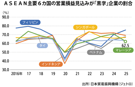 マレーシア日系、25年は6割が黒字予想割合はASEAN主要国で最低PICK UP経済マクロ経済統計雇用・労務日本貿易振興機構(ジェトロ)がこのほど発表した「2025年度海外進出日系企業実態調査アジア・オセアニア編」で、マレーシアに進出する日系企業の約6割が2025年…