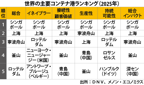 シンガポール世界の主要コンテナ港ランク、首位を獲得運輸貿易統計インフラ海運NEW海事関連の認証サービスを手がけるノルウェーのDNVとコンサルタント会社メノン・エコノミクスが発表した2025年版「世界の主要コンテナ港」ランキングで、シン…