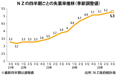 ニュージーランドNZ失業率、5.3%に上昇9年ぶり高水準経済マクロ経済統計金融一般雇用・労務ニュージーランド(NZ)政府統計局(SNZ)が5日に発表した、2025年第3四半期(7~9月)の失業率(季節調整値)は5.3%と前期比0.1ポイント上昇、前年同…