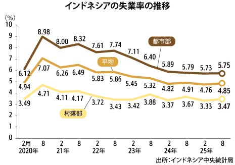 インドネシア8月の失業率4.85%、前年同月から小幅改善PICK UP経済マクロ経済統計雇用・労務 インドネシア中央統計局は5日、8月時点の失業率が4.85%だったと発表した。前年同月から0.06ポイント下がったものの、半年前(2月)からは0.09ポイント上昇…