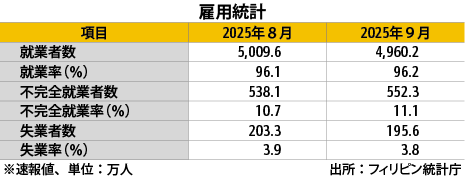 フィリピン9月失業率、3.8%に改善経済統計雇用・労務NEWフィリピン統計庁(PSA)が6日発表した雇用統計(速報値)によると、9月の失業率は3.8%だった。8月の3.9%からわずかに低下し、2カ月連続で改善した。 …