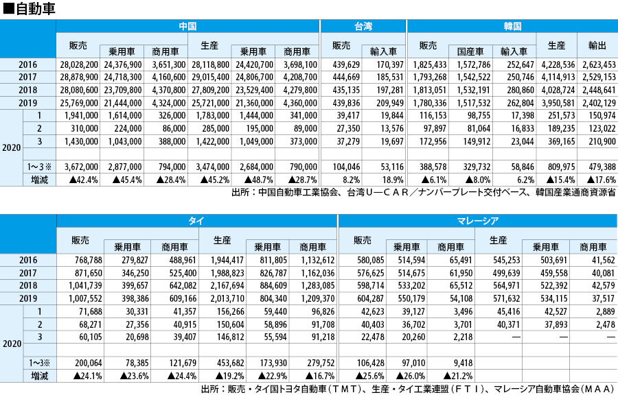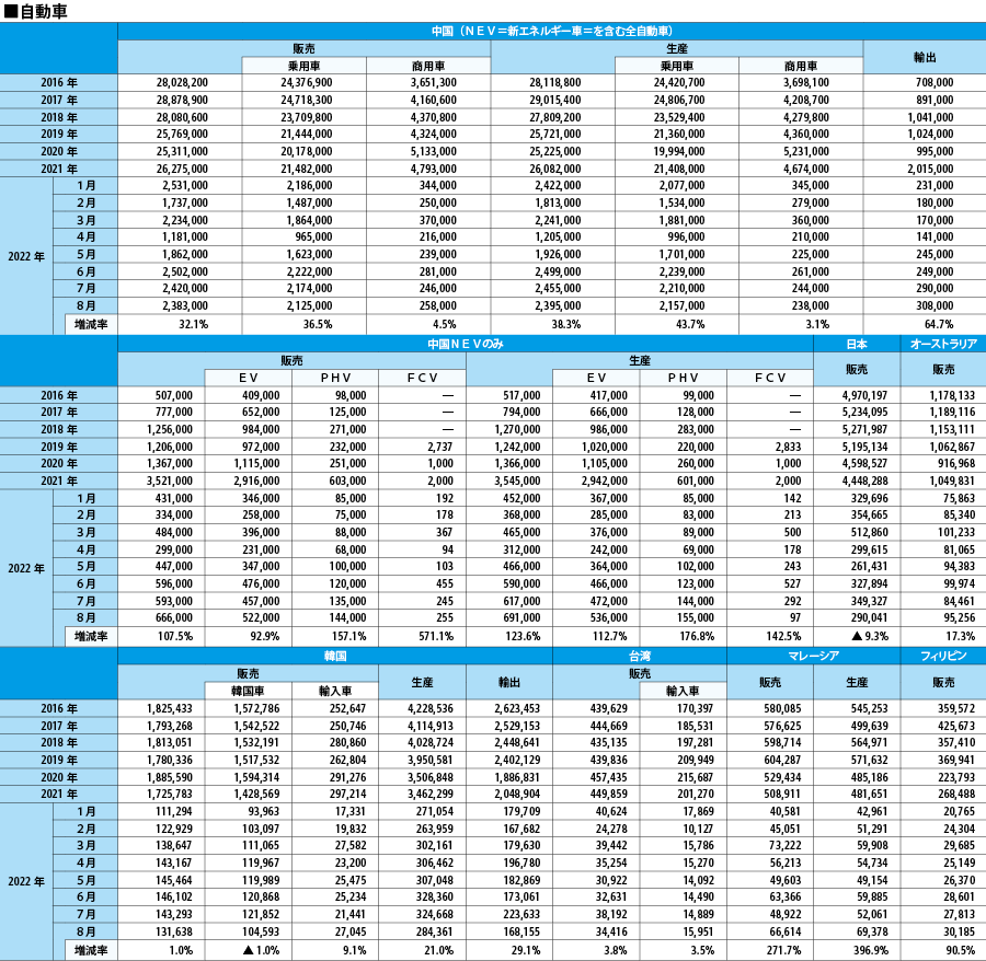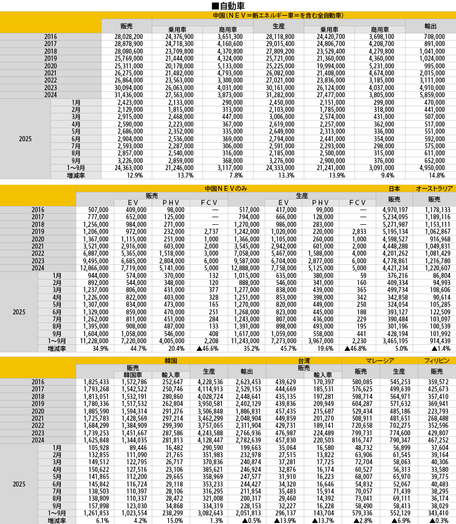 日本、中国、台湾、韓国、タイ、マレーシア、シンガポール、インドネシア、フィリピン、ベトナム、ミャンマー、インド、オーストラリア13か国・地域の自動車・二輪車データをまとめました。毎月第1火曜日に更新します。