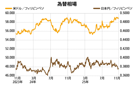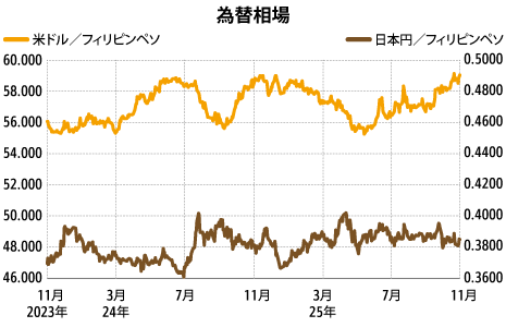 フィリピン【フィリピン為替情報】約2年ぶりのペソ安値圏で攻防戦金融マクロ経済金融一般証券政治一般政策・法律・規制■これまでの動き(11月18~29日) 11月18日の週の米ドル・フィリピンペソ為替相場は1米ドル=58.670ペソで取引を開始した。 前週に1米ドル=58.870ペソまで下…