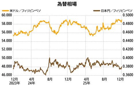 フィリピン【フィリピン為替情報】米比の金融緩和ペースに差、ドル買い優勢に金融マクロ経済貿易統計金融一般証券政治一般政策・法律・規制■これまでの動き(2024年12月16日~25年1月10日) 24年12月16日の週の米ドル・フィリピンペソ為替相場は、1米ドル=58.600ペソで取引を開始した。日米比の金…