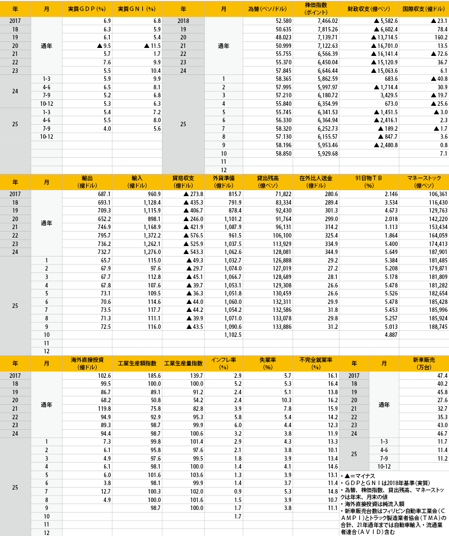 政府発表などを基に貿易額、OFW送金額、失業率、新車販売台数といった主要経済指標を最終水曜日に更新する。