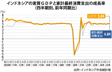 インドネシア7~9月のGDP成長率、5.04%に減速経済マクロ経済統計NEWインドネシア中央統計局は5日、2025年第3四半期(7~9月)の実質国内総生産(GDP)成長率が前年同期比5.04%だったと発表した。2四半期連続で5%を超え…