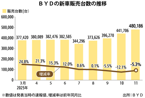 中国深センBYDの11月販売、3カ月連続のマイナス車両統計自動車 中国自動車最大手で「新エネルギー車(NEV)」専業の比亜迪(広東省深セン市、BYD)は2日、2025年11月の新車販売台数(速報値)が前年同月比5.3%減の…