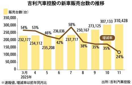 中国浙江吉利汽車の11月販売、単月過去最高台数に車両貿易統計自動車 自動車大手の浙江吉利控股集団(浙江省杭州市)の香港上場子会社、吉利汽車控股が1日発表した2025年11月の新車販売台数(速報値)は、前年同月比24%増の31万…