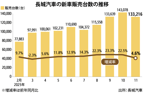 中国河北長城汽車の11月販売、8カ月連続プラス車両統計自動車自動車メーカーの長城汽車(河北省保定市)が2日発表した2025年11月の新車販売台数(速報値)は、前年同月比4.6%増の13万3,216台だった。プラス成長は8カ月連…