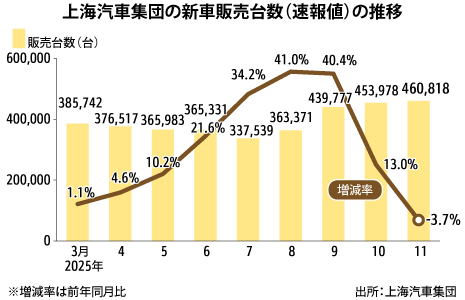 中国上海上汽の11月販売4%減、11カ月ぶりマイナス車両貿易統計自動車自動車大手の上海汽車集団(上海市、上汽集団)が2日発表した2025年11月の新車販売台数(速報値)は、前年同月比3.7%減の46万818台だった。マイナスは11カ月ぶ…