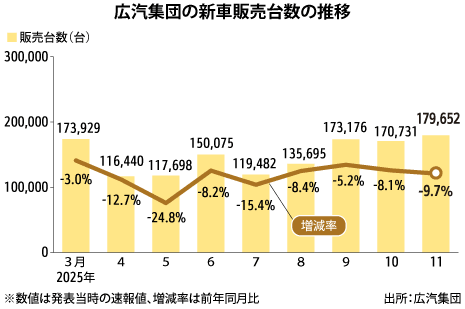 中国広東広汽集団の新車販売、11月は10%減の18万台車両統計自動車自動車大手の広州汽車集団(広東省広州市、広汽集団)は6日、同社出資の主要メーカーを合わせた2025年11月の新車販売台数(速報値)が前年同月比9.7%減の17万9…