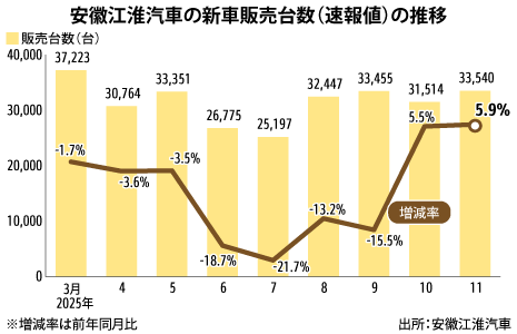 中国安徽江淮汽車の11月販売、6%増の3.3万台車両統計自動車自動車メーカーの安徽江淮汽車集団(安徽省合肥市)が9日発表した2025年11月の新車販売台数(シャシー含む、速報値、以下同)は、前年同月比5.9%増の3万3,540…