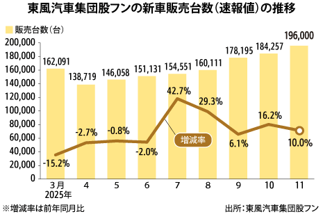 中国湖北東風汽車の11月販売10%増、単月の今年最高車両統計自動車自動車大手の東風汽車集団股フン(湖北省武漢市)が8日発表した2025年11月の新車販売台数(速報値)は、前年同月比10.0%増の19万6,000台だった。プラスは5カ月…