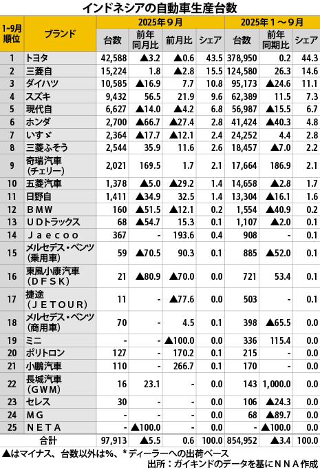 インドネシア[資料]25年1~6月の日系モデル別生産台数車両統計自動車インドネシア自動車製造業者協会(ガイキンド)が公表したデータによると、2025年1~6月の日系メーカーの新車生産台数は49万1,574台だった。新車生産台数全体(…