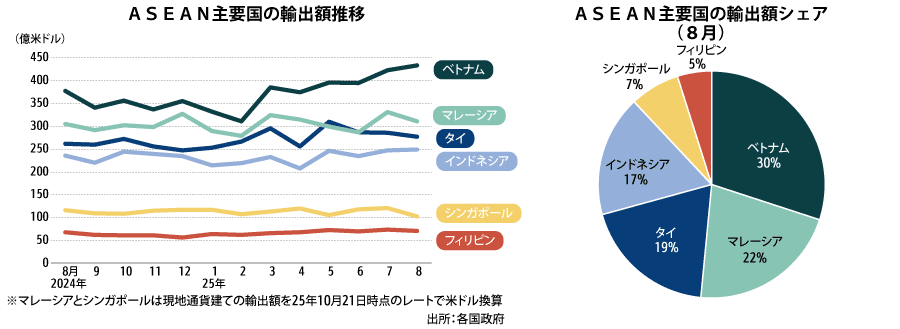 ASEAN【グラフでみるASEAN】輸出額(9月)6カ国全てで前年同月上回る経済マクロ経済貿易統計東南アジア諸国連合(ASEAN)主要6カ国の2025年9月の輸出額は、全ての国で前年同月を上回った。うち5カ国は2桁増と好調だった。 最も増加率が高かった…