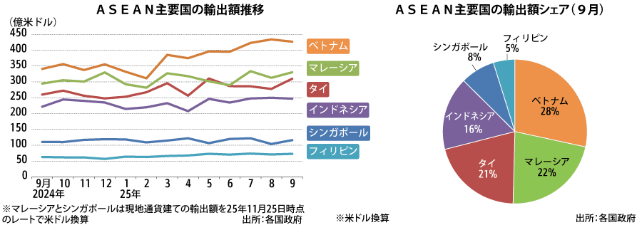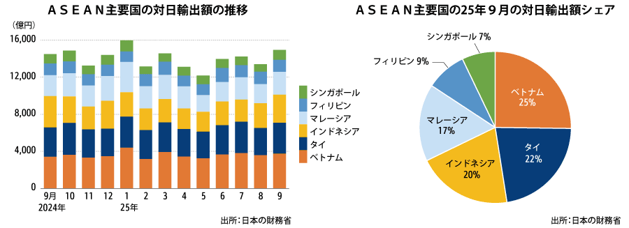 ASEAN【グラフでみるASEAN】対日貿易(9月)輸出3%増、5カ国で前年超え経済貿易統計日本の財務省が発表した貿易統計で、東南アジア諸国連合(ASEAN)主要6カ国の2025年9月の対日輸出額は、前年同月比3%増の1兆4,957億円だった。6カ国中…