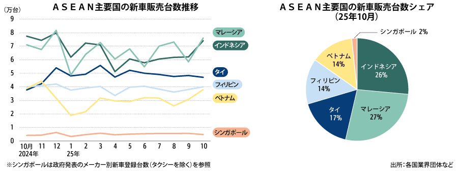 ASEAN【グラフでみるASEAN】新車販売(9月)3%減、インドネシア2桁減続く経済統計自動車東南アジア諸国連合(ASEAN)主要6カ国の2025年9月の新車販売台数は、前年同月比3%減の24万3,288台だった。主要市場であるインドネシアが5カ月連続の2…