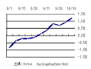 インド【グラフで読むインド】週間卸売物価指数、上昇続きインフレ懸念経済マクロ経済統計 10月17日までの1週間の卸売物価指数(WPI)上昇率は年率換算で1.51%となり、前の週の1.21%から上げ幅が拡大、インフレ懸念が浮上している。