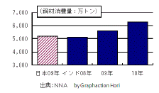 インド【グラフで読むインド】鋼材消費量、10年には6千万トン超経済マクロ経済統計鉄鋼・金属 インドの2008年の鋼材消費量は5,136万トンで、世界5位だった。09年は前年比8.9%増の5,593万トンとなり、日本と韓国を抜き3位に躍進するとみられる。10年は…