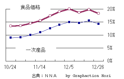 インド【グラフで読むインド】食品卸売価格、18.2%上昇経済マクロ経済統計 12月26日までの1週間の「1次産品」の卸売物価指数(WPI)は、前週比で0.67%、前年同期比で14.39%の上昇した。食品価格の高騰は特に激しく、前年同期比18.…