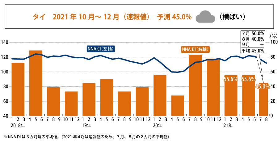 NNA景気指数・・NNA記事からセンチメント分析を行い、それを各国の経済指標と合成したものにより経済状況等を表したものです。NNA景気指数には、NNA景気状況指数(CI(Composite Index:))、NNA景気動向指数(DI(Diffusion Index))の2種類が存在しています。この2つの指標を使い各国の景気の動向を見ていきます。指数の算出式、参考にしている経済指標等の詳細はこちらをご覧ください。