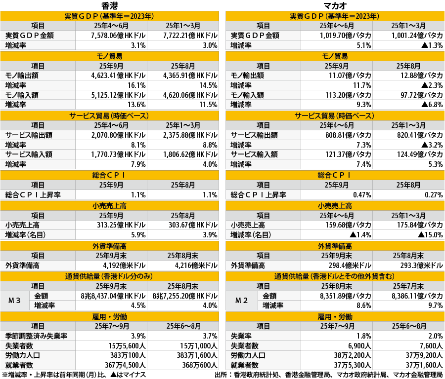 香港とマカオの各種経済・社会統計数値をお届けします。