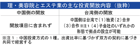 2013年6月に調印された中台サービス貿易協定。締結過程が不透明だとする野党の抵抗で立法院(議会)での批准が意図的に引き伸ばされてはいるが、14年中の発効はほぼ確実となった。中国側はWTO(世界貿易機関)加盟時の承認内容を上回る80件(金融15件含む)、台湾側は64件(金融9件含む)の市場開放を承認。台湾では中国市場開拓の好機だとの認識がある一方、低価格を掲げた中国企業の台湾市場席巻と、雇用市場の混乱などを恐れる安全保障上の不安も根強い。サービス貿易協定の概要をあらためて示すとともに、台湾にとっての利益と不利益、日本企業の見方などを追う。