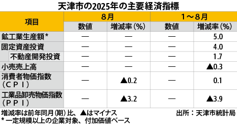 中国天津天津の1~8月経済統計、鉱工業は5.0%増経済マクロ経済統計天津市統計局が発表した同市の2025年1~8月の鉱工業生産額(一定規模以上の企業対象、付加価値ベース)は前年同期比5.0%増加した。伸び率は1~7月から0.1ポ…