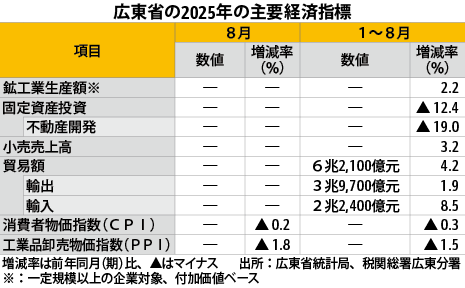 中国広東広東省の鉱工業生産、1~8月は2.2%増経済マクロ経済統計広東省統計局が19日発表した同省の2025年1~8月の主要経済指標によると、鉱工業生産額(一定規模以上の企業対象、付加価値ベース)は前年同期比2.2%増となった…