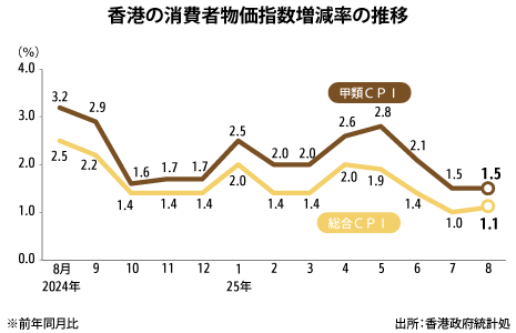 香港8月のCPI上昇率1.1%、伸び幅0.1P拡大PICK UP経済マクロ経済統計香港政府統計処は22日、総合消費者物価指数(総合CPI)が8月は前年同月比1.1%上昇したと発表した。上昇率は前月から0.1ポイント拡大し、4カ月ぶりに前月を…