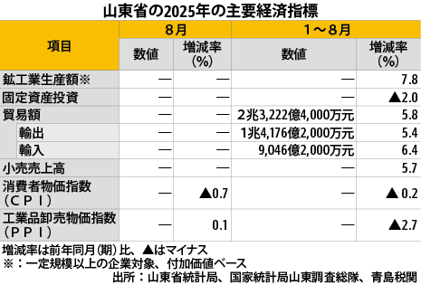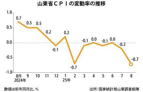 中国山東山東のCPI、8月は0.7%下落経済マクロ経済統計国家統計局山東調査総隊によると、山東省の2025年8月の消費者物価指数(CPI)は前年同月比0.7%下落した。下落は2カ月連続で、下落率は前月から0.5ポイント…