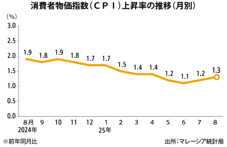 マレーシア8月CPI1.3%上昇、保険・金融が押し上げ経済マクロ経済統計マレーシア統計局が23日発表した8月の消費者物価指数(CPI、2010年=100)は134.9となり、前年同月比1.3%上昇した。上昇率は前月から0.1ポイント加速し、2…